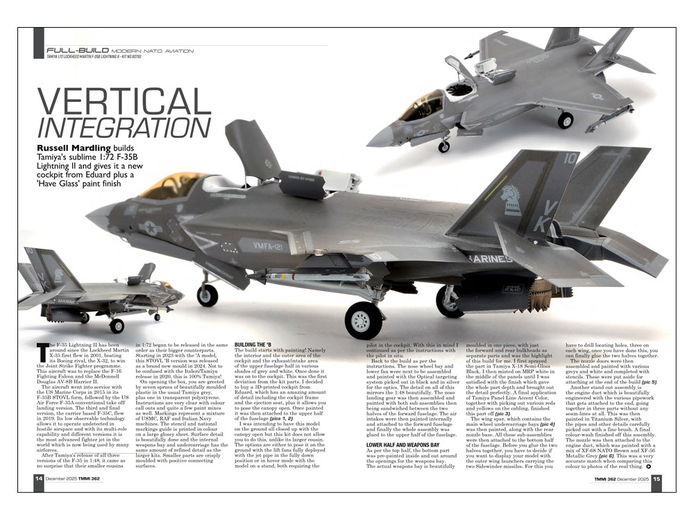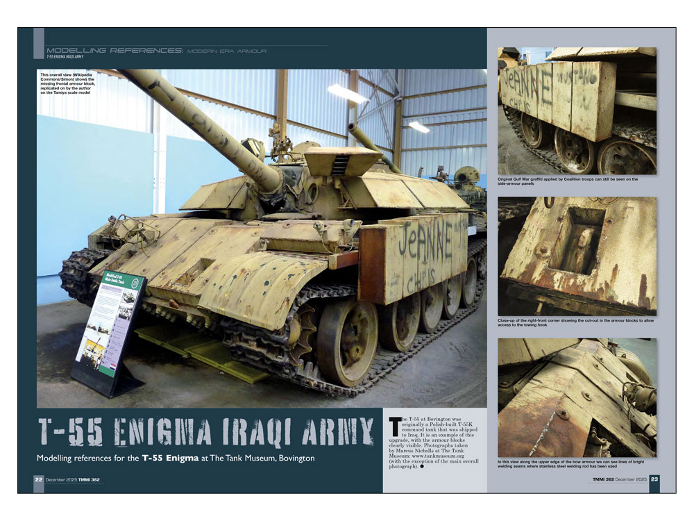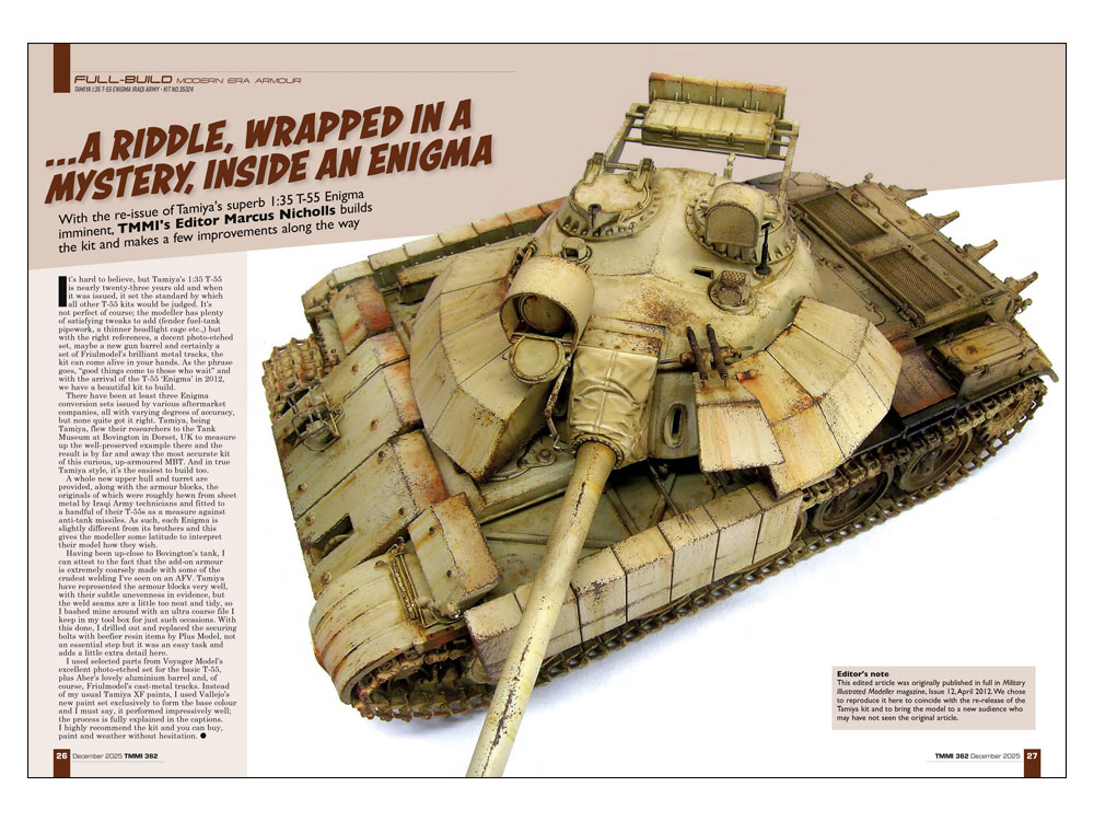 イラク軍戦車 T-55エニグマ(1/35)、コルベット C8 クーペ(1/25)、ロッキードマーチンF-35Bライトニング(1/72)、A-10A サンダーボルトU(1/48)の製作記事の他、グラマン F-14D トムキャット(1/72)、メッサーシュミット Bf109 K-4(1/32)、ホーカー シーハリケーン Mk.UC(1/32)のキットプレビューの日本語訳付き。その他にも、イギリスボービントンの戦車博物館に所蔵されているイラク軍戦車 T-55エニグマの実車資料写真も掲載しました。
